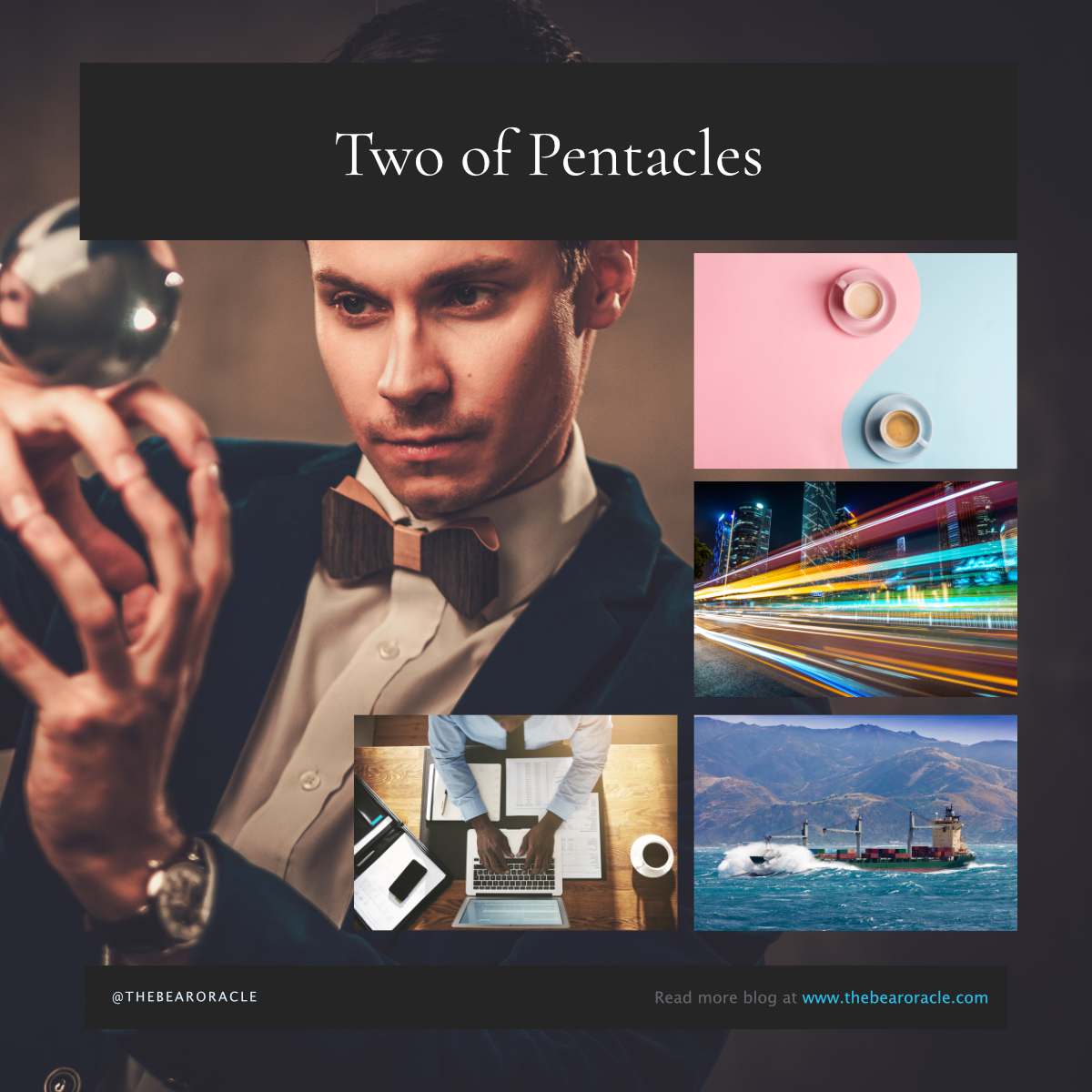 Well, the Two of Pentacles reminds us all to take these things in stride, and — if possible — with good humor. He reminds us that there is danger in duality. We can spend too much time anchored to two choices we forget that there are always other options. Those ships tossing on the waves behind head into the swells, and that is how thy remain afloat. Juggling is really just a series of throw, wait, catch, throw again sequentially for one, two, three, more balls.